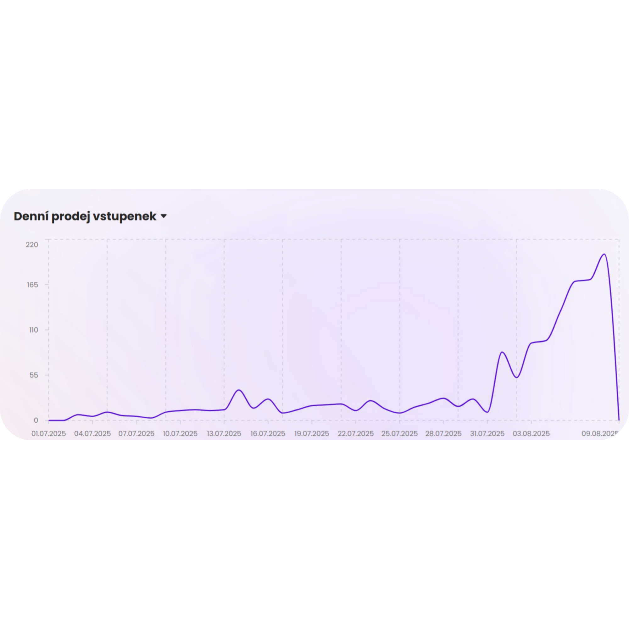 Graf níže ukazuje denní prodej vstupenek během celé kampaně. Je jasně vidět zlom po převzetí správy reklam — křivka prodejů strmě roste a vrcholí těsně před akcí díky strategické práci s urgencí.