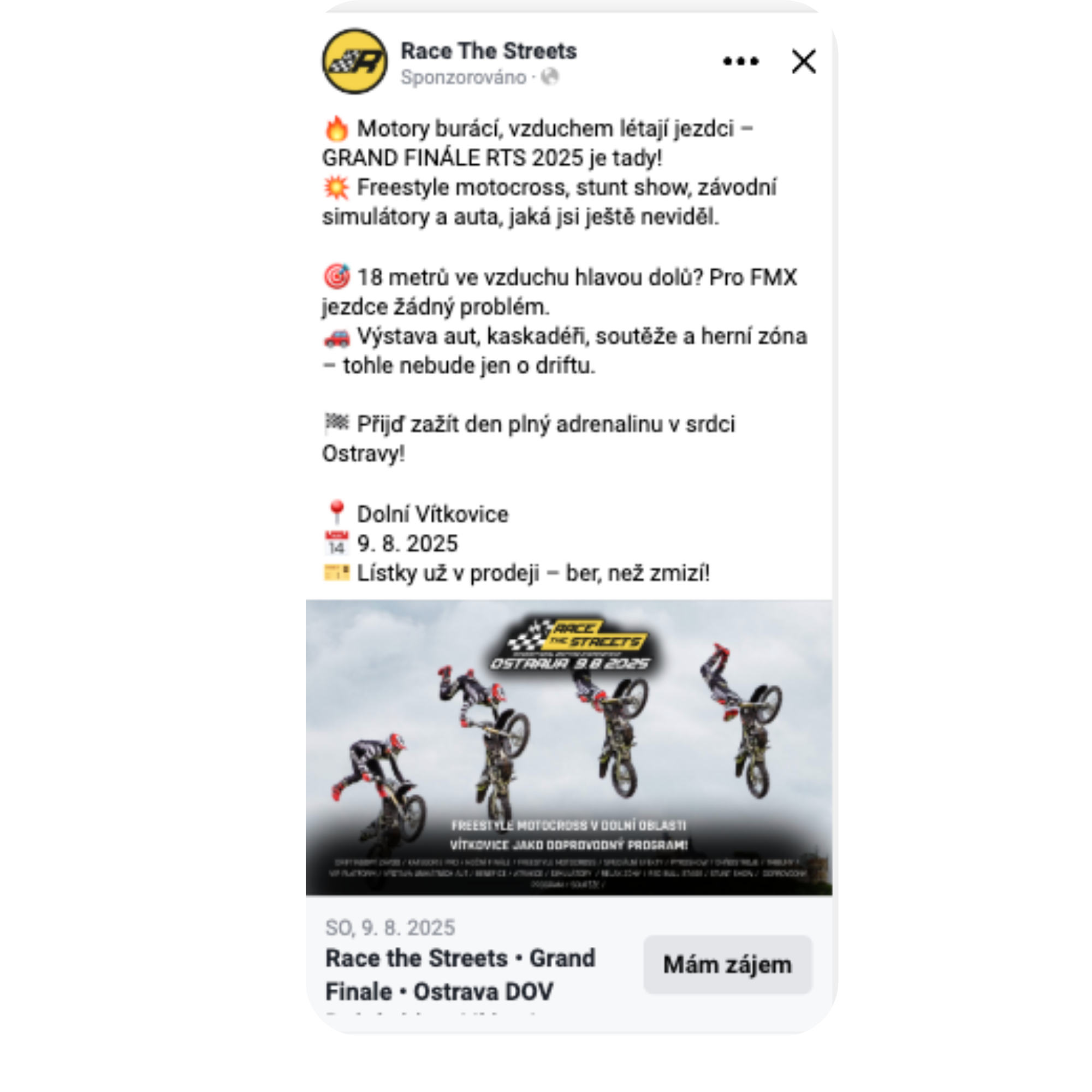 Zachovali jsme osvědčenou kampaň, ale výrazně ji vylepšili. Testovali jsme krátké i dlouhé texty, různé zájmové skupiny (motokros, motorsport, automobilové nadšence) a rozšířili geografický dosah na relevantní lokality.